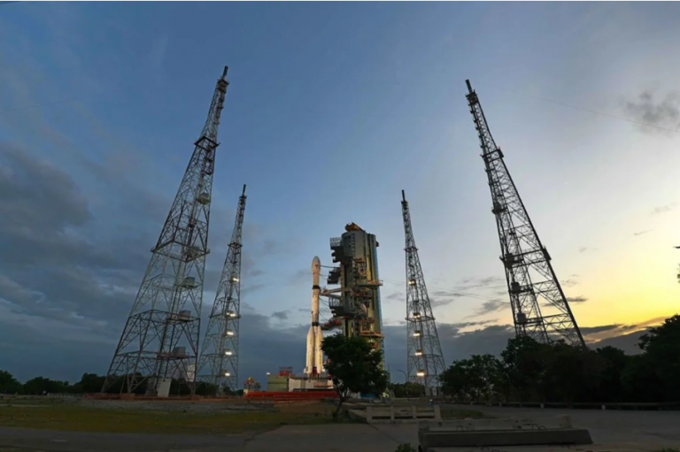 El satélite NISAR se encuentra en la plataforma de lanzamiento del Centro Espacial Satish Dhawan, en la costa sureste de la India.